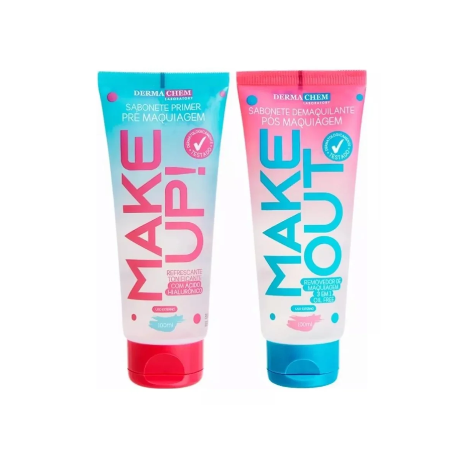 Descubra o Kit de Limpeza e Preparação Facial da Dermachem Laboratory, apresentando o poder do Sabonete Demaquilante Make Out e do Sabonete Primer Make Up. O Sabonete Demaquilante Make Out é a solução eficiente para remover maquiagem rapidamente, seja durante o banho, na pia ou com um disco de algodão. Sua fórmula inovadora, livre de óleo, limpa e hidrata profundamente a pele, deixando-a suave e sem resíduos, com pH equilibrado para garantir um cuidado delicado.